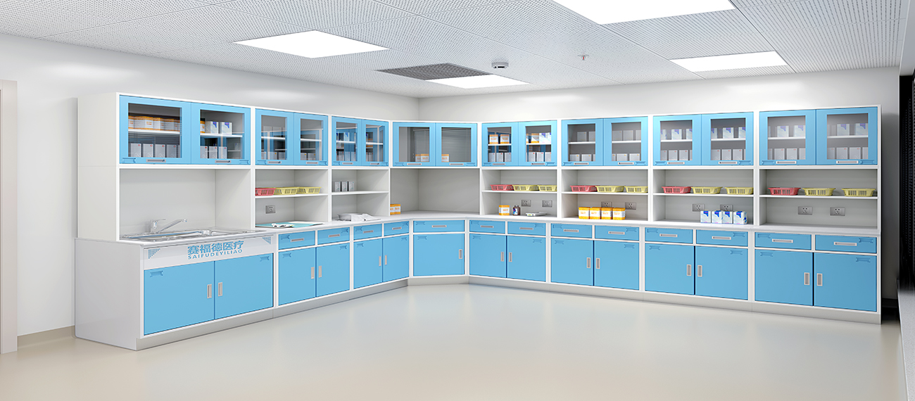 在設計治療柜時(shí)要結合醫院的整體設計,考慮潔凈的要求,治療室和處置室可配置雙面投擲垃圾柜,色彩方面,一般選用較多為藍色、綠色、灰色、木紋轉印,產(chǎn)品顏色多樣,可供客戶(hù)選擇,治療柜下方踢腳線(xiàn),采用