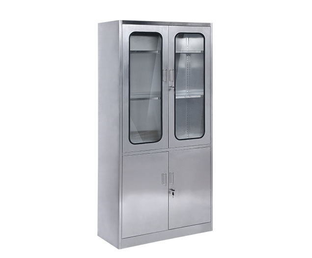 2.2 一體結構設置,上部不銹鋼框玻璃對開(kāi)門(mén),內置2層層板可調高度,內置物品可視,便于拿取,下部對開(kāi)門(mén)、設置有拉手和鎖